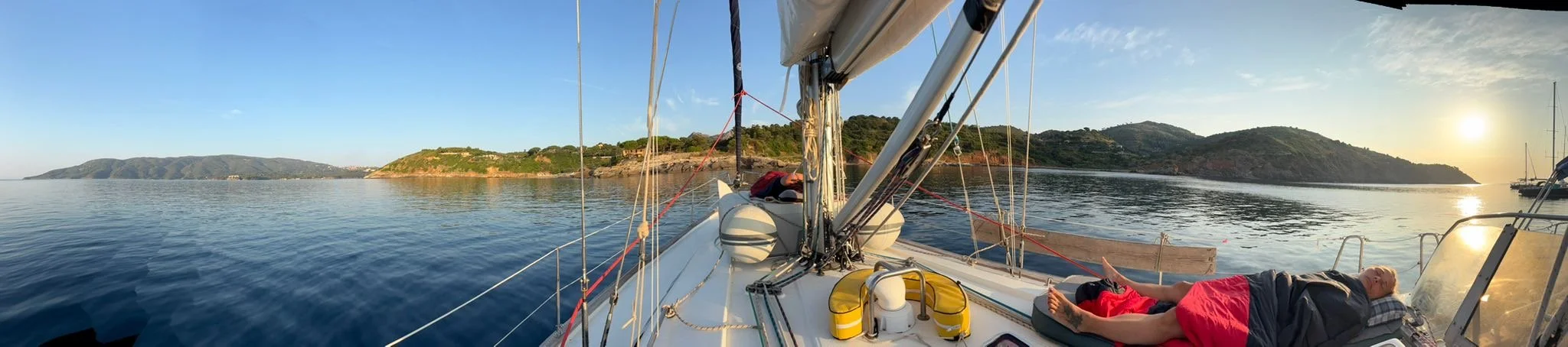 Dieses Bild entstand letztes Jahr im Juni mit den Töchtern der Meerin 2025 auf Elba. Mitten auf See aufzuwachen, von der Sonne wach geküsst zu werden, nur den Wind und die Wellen zu hören, von der Meerin sanft geschaukelt werden, es ist einfach wundervoll. Viele von uns haben die ganze Nacht gerne an Deck geschlafen, unter dem von Sternen beleuchteten Himmel. Ein ganz besonderes Erlebnis.